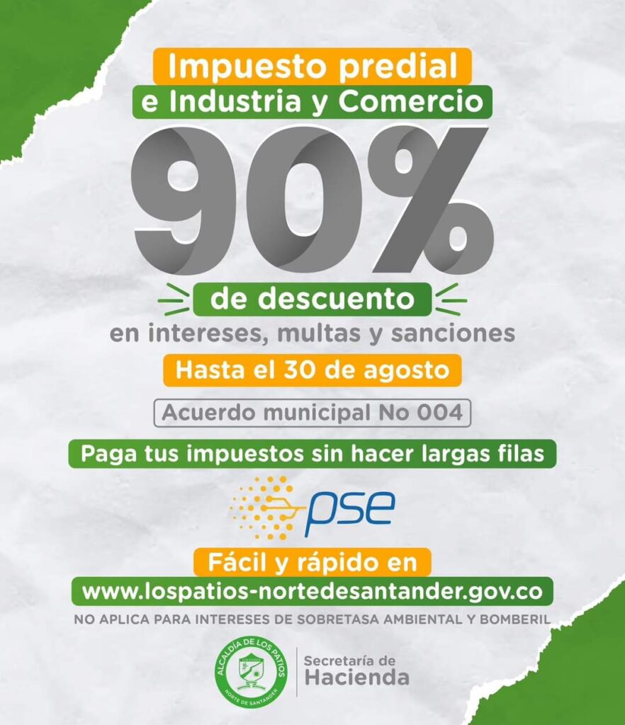 🚨¡Atención! | Aprovecha el nuevo descuento del 90% en intereses, multas y sanciones correspondientes al impuesto predial e industria y comercio en nuestro municipio. Descuento vigente hasta el 30 de agosto.