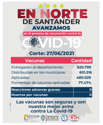 Avance del proceso de vacunación Covid-19 en Norte de Santander 💉 junio 27, 2021 Haga su Comentario Compartir Facebook Twitter Compartir Facebook Twitter