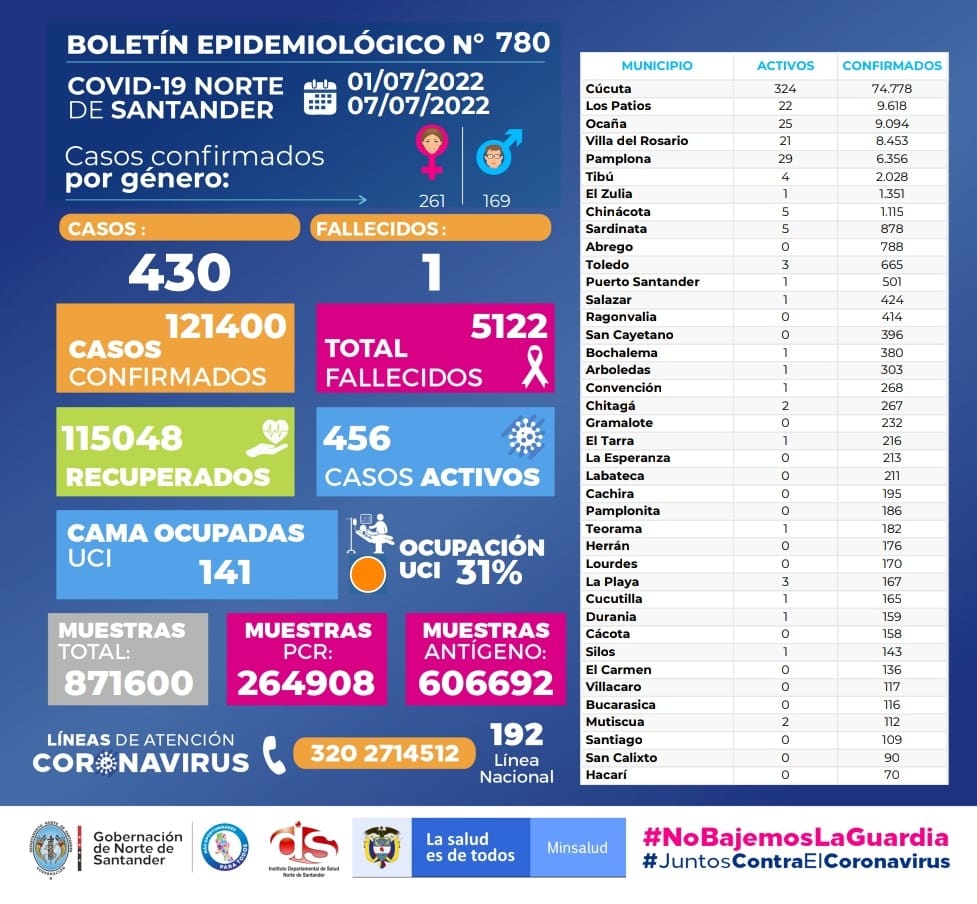 Boletín epidemiológico No. 780 sobre la situación de Covid-19 en Norte de Santander, correspondiente a la semana del 01/07 al 07/07 de 2022.