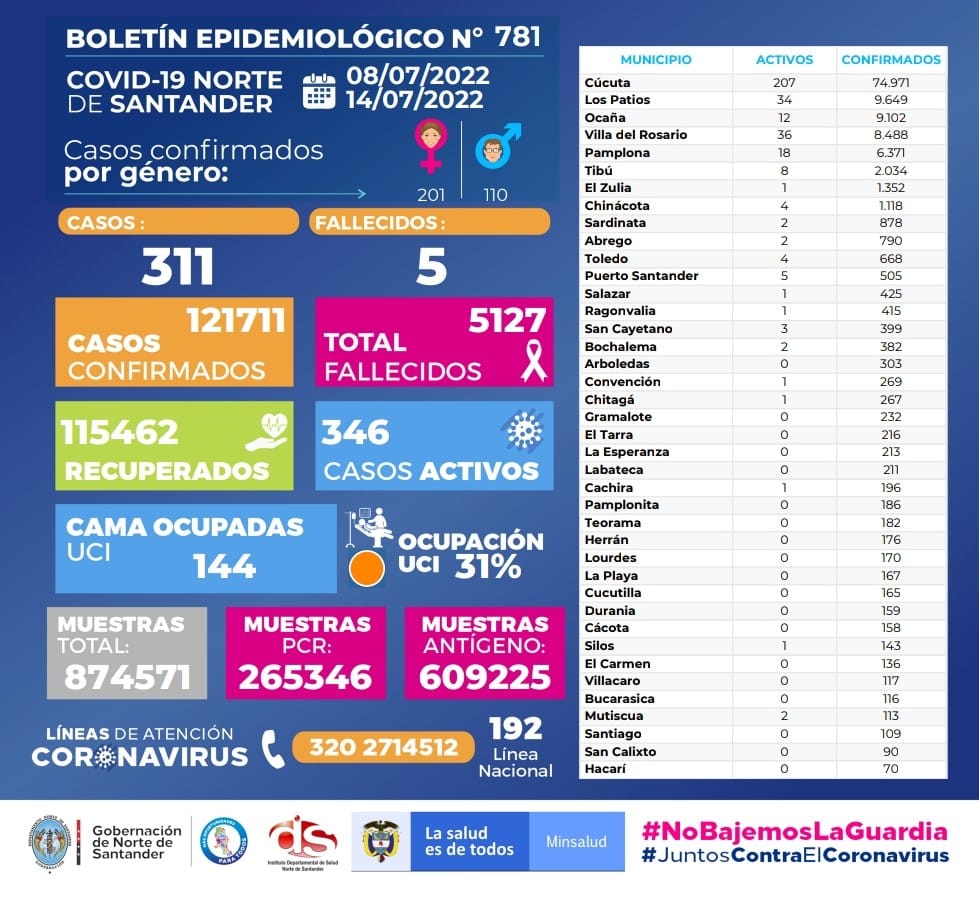 boletín epidemiológico No. 780 sobre la situación de Covid-19 en Norte de Santander, correspondiente a la semana del 08/07 al 14/07 de 2022.