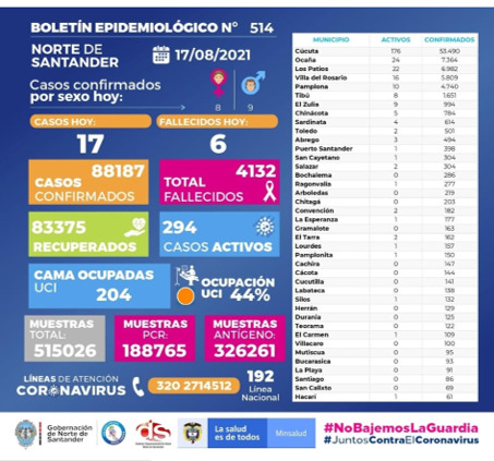 boletín epidemiológico sobre la situación de Covid-19 en Norte de Santander. agosto 18, 2021 Haga su Comentario Compartir Facebook Twitter Compartir Facebook Twitter