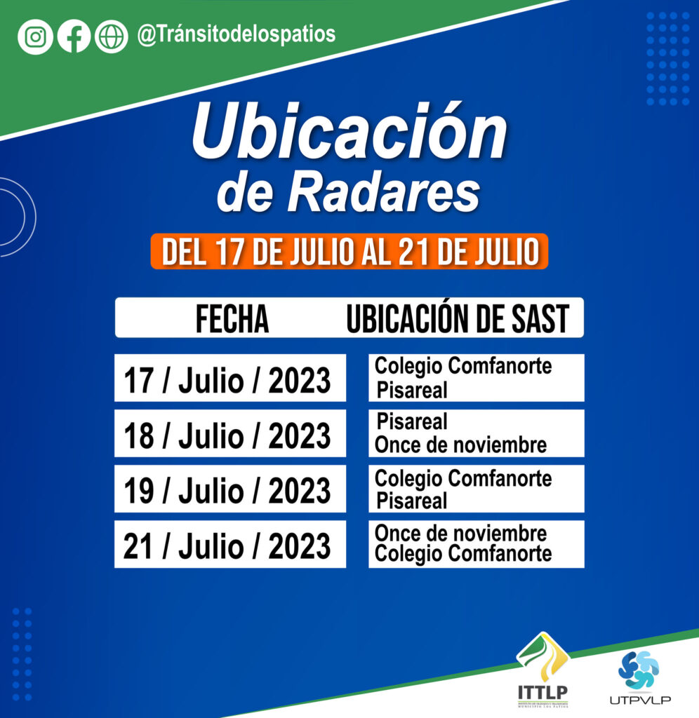 Compartimos la ubicación del 17 al 21 de julio de los medios tecnológicos para la detección de presuntas infracciones por exceder el límite de velocidad permitido en el Municipio de Los Patios.