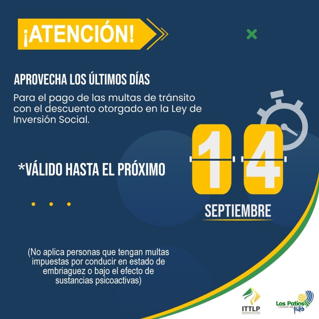 Hasta el miércoles 14 de septiembre se aplicarán los descuentos que se ofrecen por el pago de multas de tránsito que esten sancionadas antes del 30 de junio de 2021. Además de los descuentos no se cobrarán intereses de mora.Por el pago de estas obligaciones se aplican descuentos del 40% para motos y 20% para carros, sobre el valor capital de la deuda; además del descuento del100% de los intereses generados. Estos descuentos se ofrecen con motivo de La Ley 2155 de 14 de septiembre de 2021, llamada Ley de Inversión Social, que contempla una serie de soluciones en materia social, económica y fiscal, enmarcadas en tres objetivos fundamentales: proteger a los más vulnerables, reactivar la economía y estabilizar las finanzas públicas.