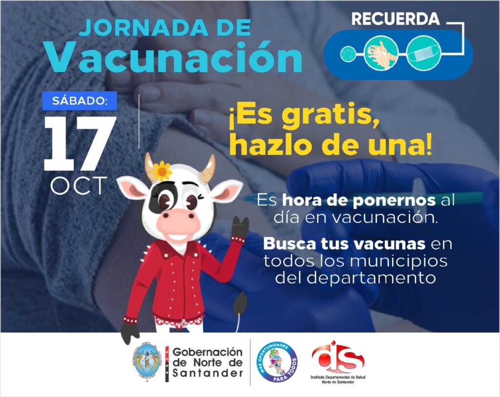 Para dar continuidad a la Jornada de Intensificación de Vacunación, este sábado 17 de Octubre en todo el departamento Norte de Santander se activaran todos los puntos de vacunación del departamento, por tal motivo, la Gobernación y el Instituto Departamental de Salud, en cabeza del Dr. Carlos Arturo Martínez García, invitan a toda la comunidad a participar enérgicamente de esta actividad por el pro de nuestra infancia.