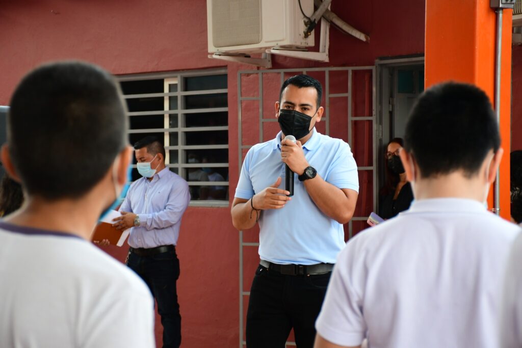 El alcalde José Miguel Bonilla dio la bienvenida a los estudiantes de la Institución Educativa Patio Centro #2, que hoy inician clases presenciales después de casi 2 años de virtualidad. Así mismo, les recordó a todos los estudiantes el correcto uso del tapabocas y los protocolos de bioseguridad para evitar un aumento considerable de contagios por COVID-19. #PonleCorazónATuSalud