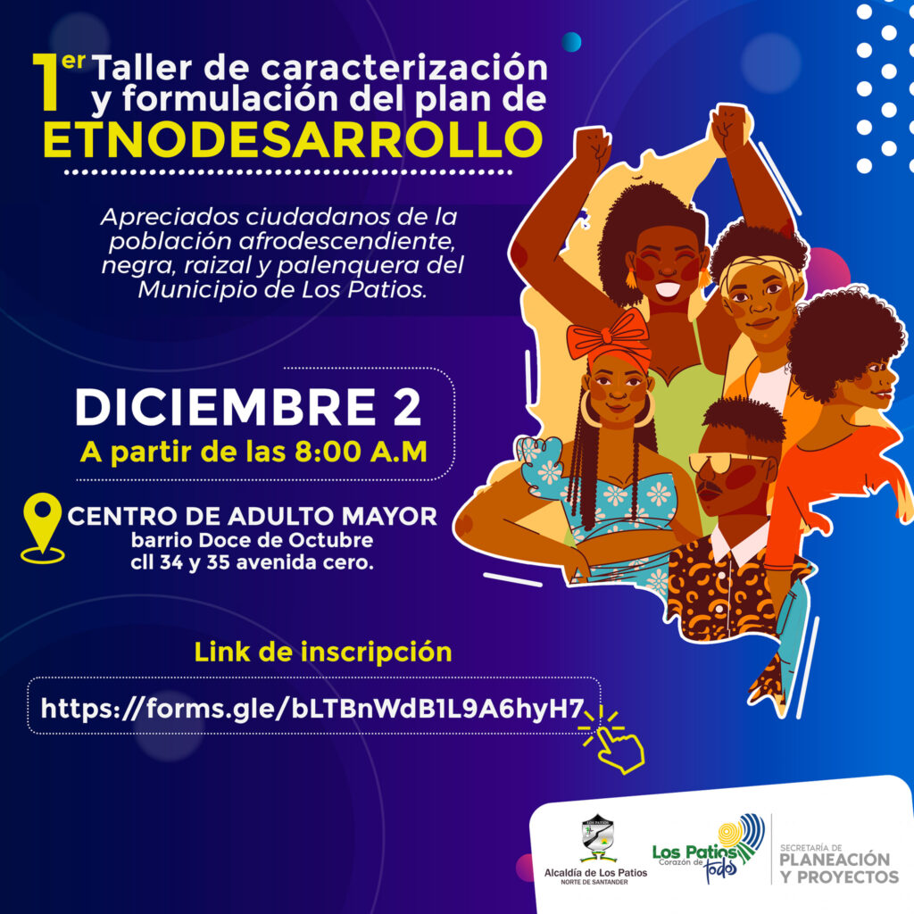 Con el interés de fortalecer el futuro colectivo de nuestra población Negra, Afrodescendiente, Raizal y Palenquera (NARP), la Alcaldía del Los Patios ha iniciado la construcción del Plan de Etnodesarrollo por medio de una caracterización general a cada integrante de la población que tenga su domicilio en en Municipio, para ello los invitamos el próximo viernes 2 de diciembre en las instalaciones del Centro para el adulto mayor del 12 de octubre a partir de las 7:50 am, a este primer encuentro de construcción y concertación de acciones en beneficio de tod@s.