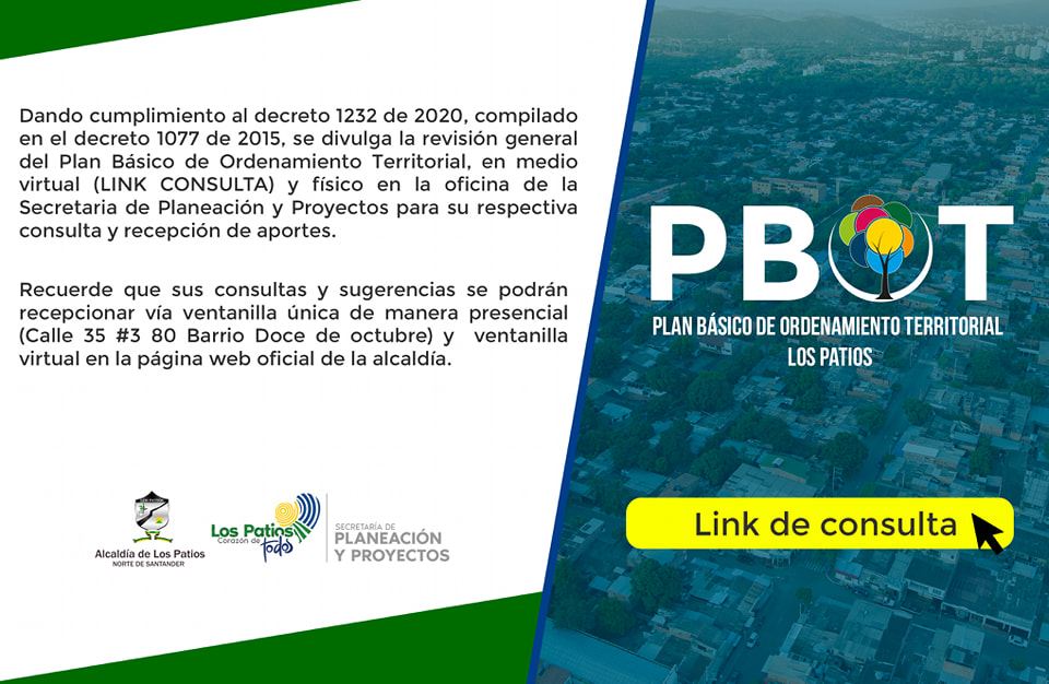 Dando cumplimiento al decreto 1232 de 2020, compilado en el decreto 1077 de 2015, se divulga la revisión general del Plan Básico de Ordenamiento Territorial, en medio virtual(LINK CONSULTA) y físico en la oficina de la Secretaria de Planeación y Proyectos para su respectiva consulta y recepción de aportes. Recuerde que sus consultas y sugerencias se podrán recepcionar vía ventanilla única de manera presencial (Calle 35 #3 80 Barrio Doce de octubre) y ventanilla virtual en la página web oficial de la alcaldía.LINK CONSULTA