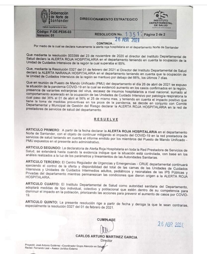 🚨#ATENCIÓN Gobernador de Norte de Santander Silvano Serrano declara ALERTA ROJA hospitalaria debido al incremento de ocupación de camas UCI y casos positivos en la región.