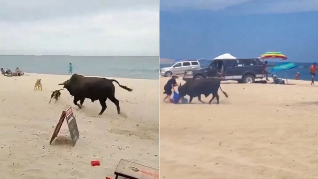 En un video que se ha vuelto viral en las redes sociales, se puede observar a un toro negro, de aproximadamente 500 kilos, corriendo por la playa y atacando a los bañistas. El sorprendente incidente tuvo lugar en la playa La Fortuna, en Baja California Sur, México.