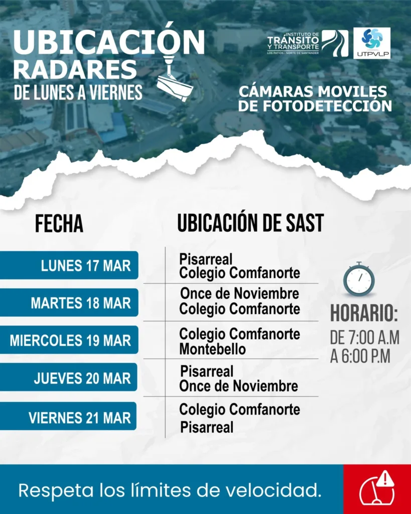 ubicación de las cámaras de fotodetección semiautomáticas. Recuerda cumplir los límites de velocidad.
